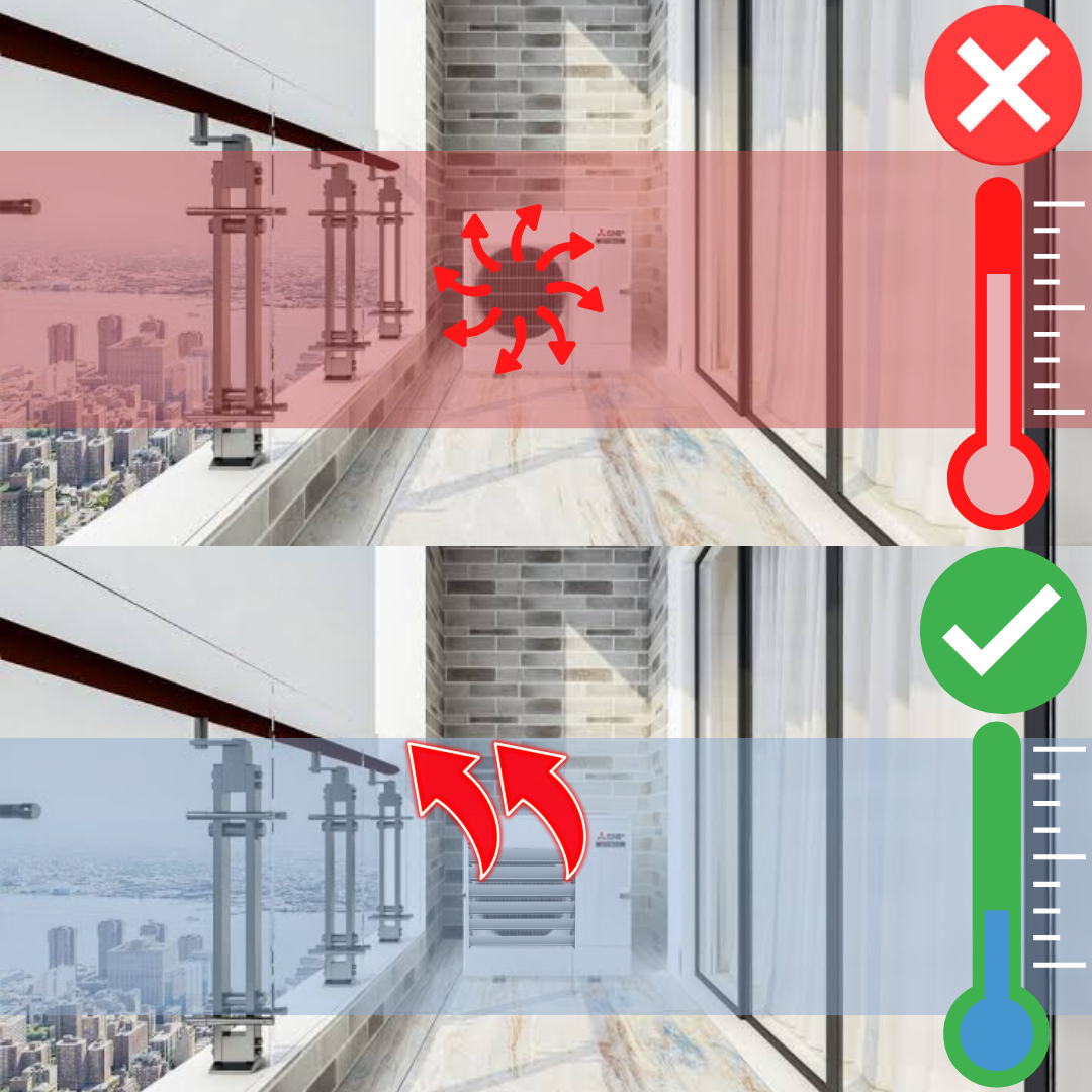Performance can drop up to 50% with inadequate ventilation as the air recirculates, freezing or overheating the AC system. Fix this by installing an Aussie Air Bender | Magnetic Air Deflector. Improve airflow by deflecting the air upwards, away from a fence or obstruction.